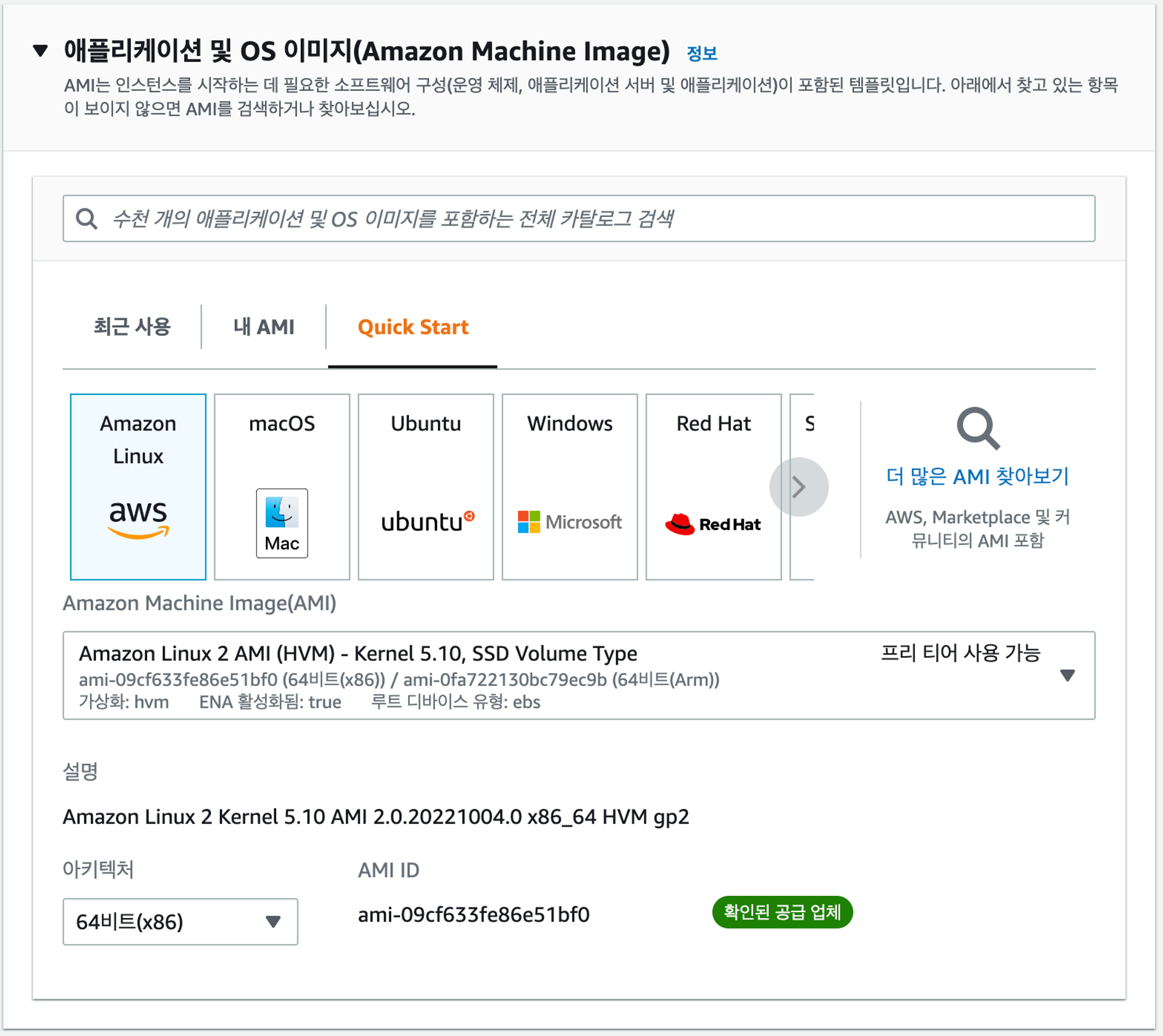 6. 애플리케이션 및 OS 이미지 선택: EC2 인스턴스에 설치할 OS를 선택