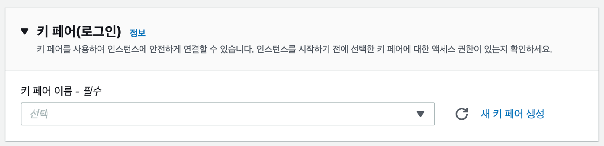 8. 키 페어 : SSH 연결과 같은 인스턴스 접속 할때 사용할 키 선택 OR 생성