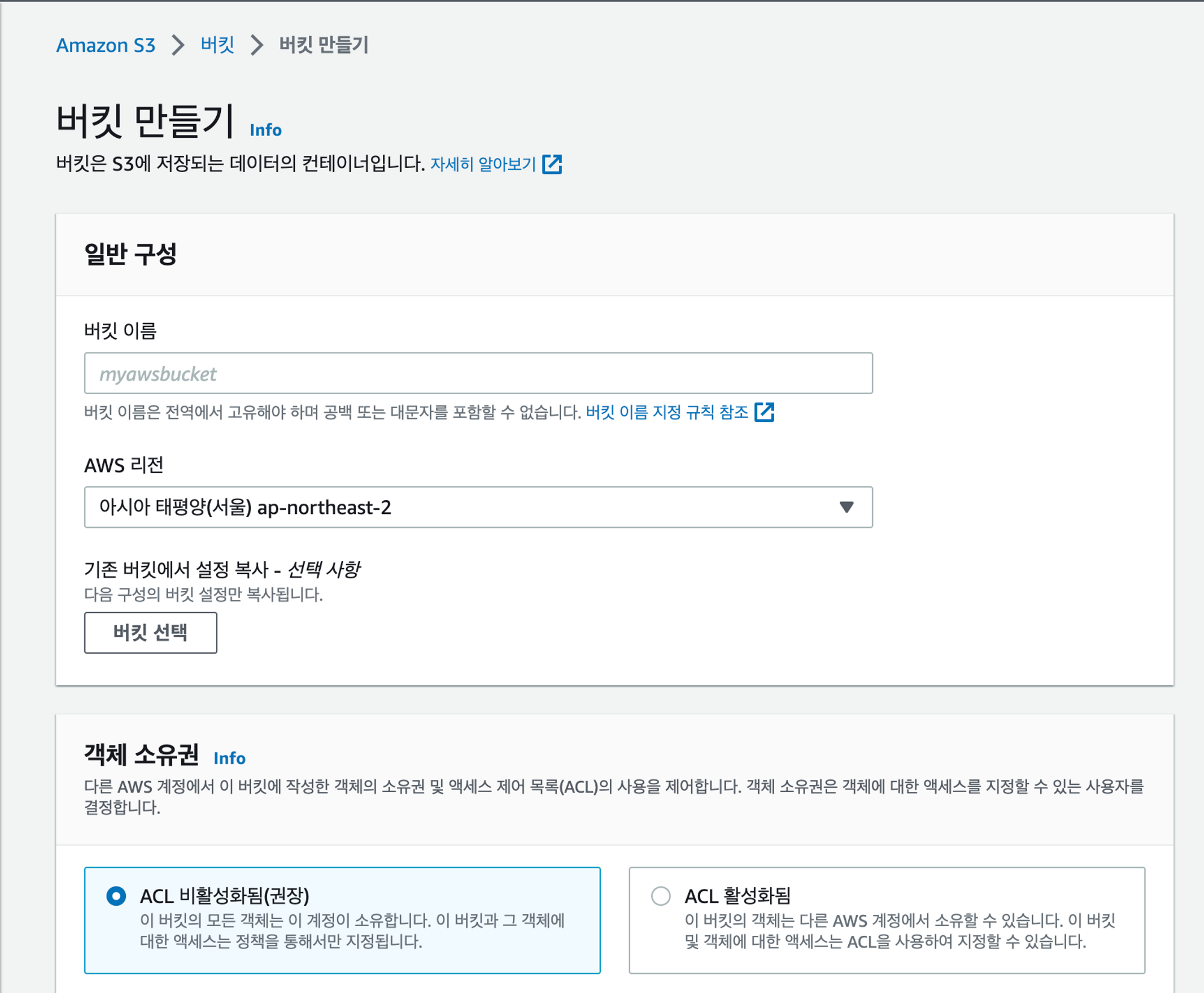 아시아 태평양(서울)선택 - 그 외에 모든 설정은 그대로 버킷 생성