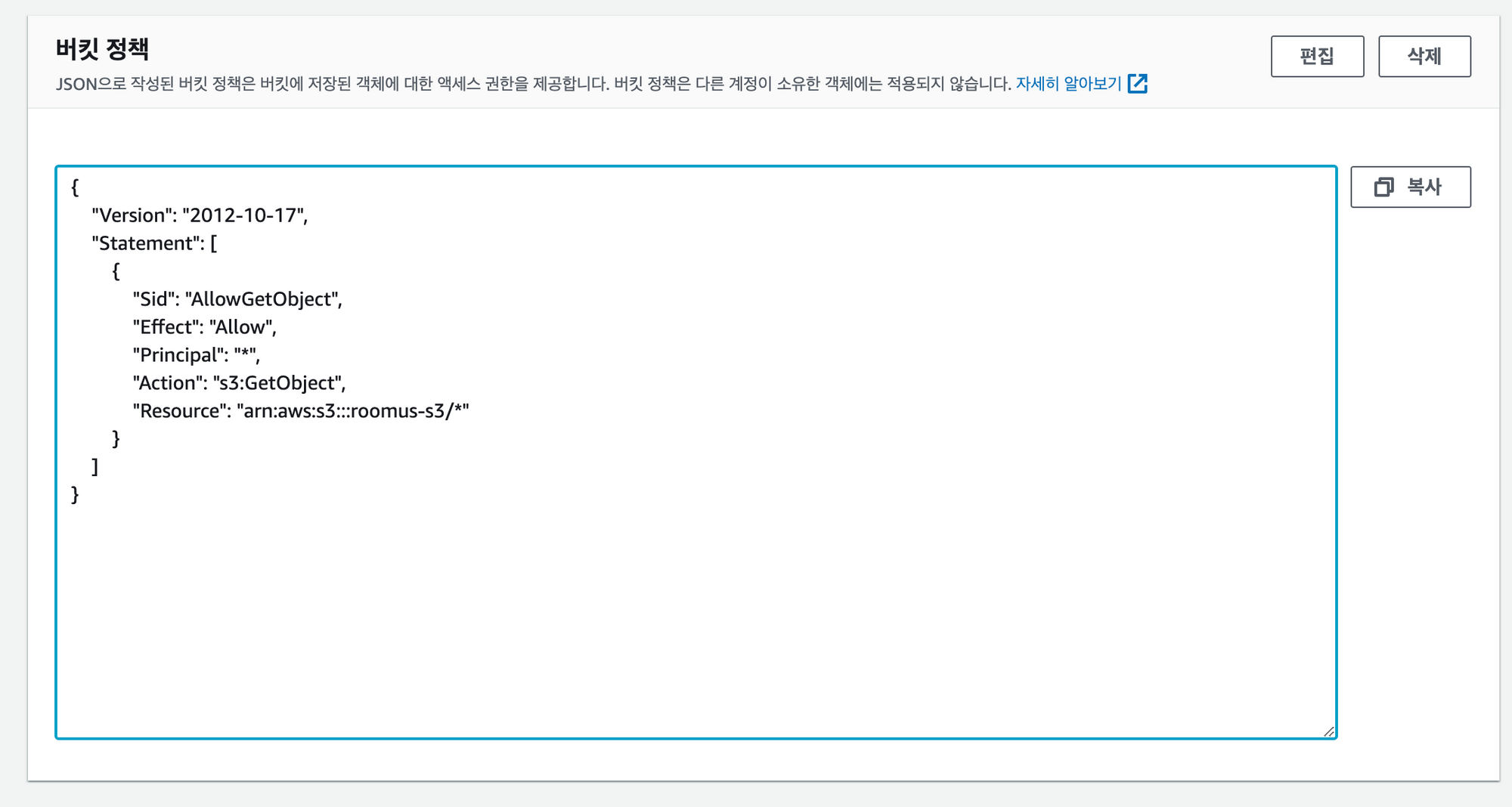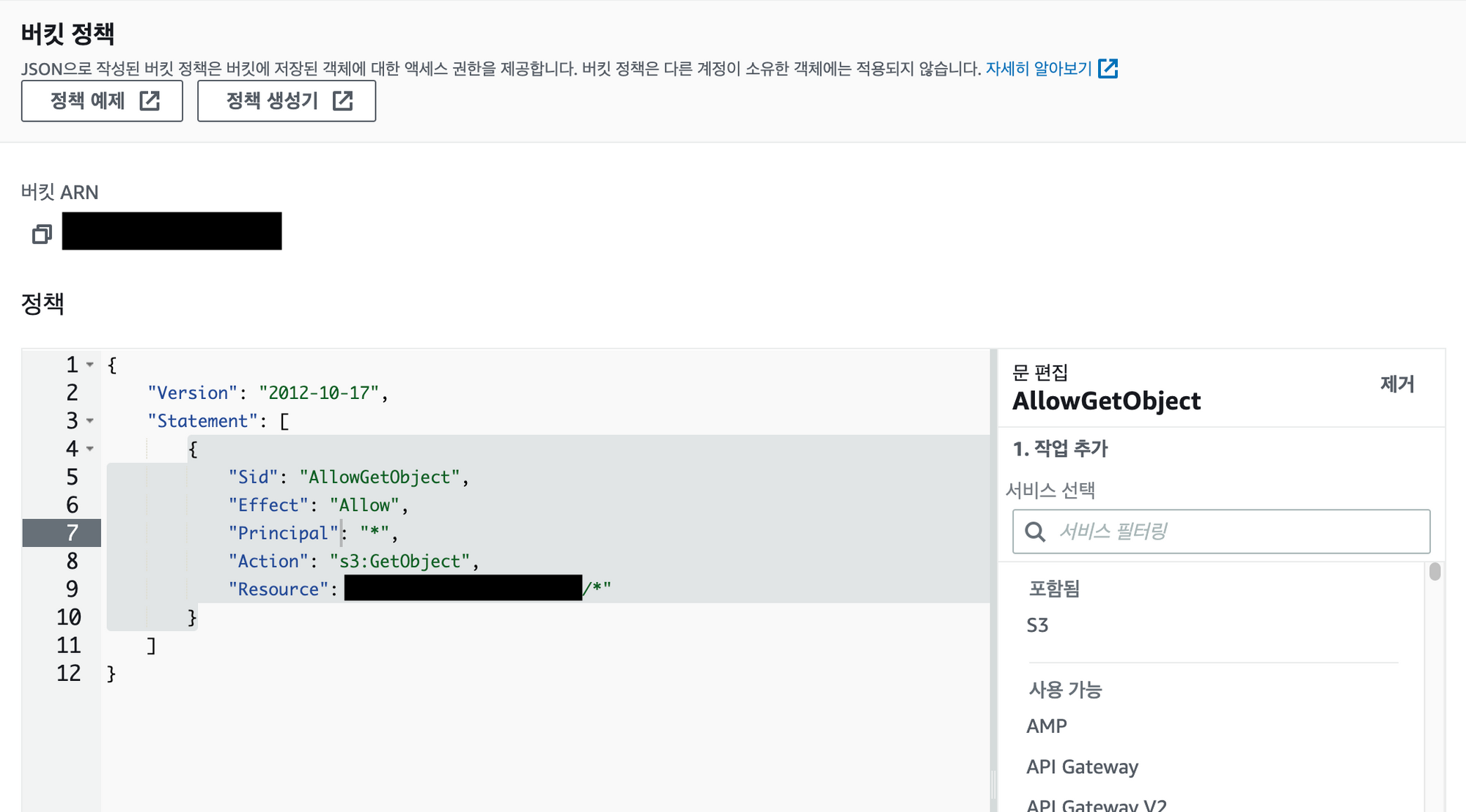 "Resource": "arn:aws:s3:::bucketname/*", // 대상이 대는 Bucket에 대한 명세