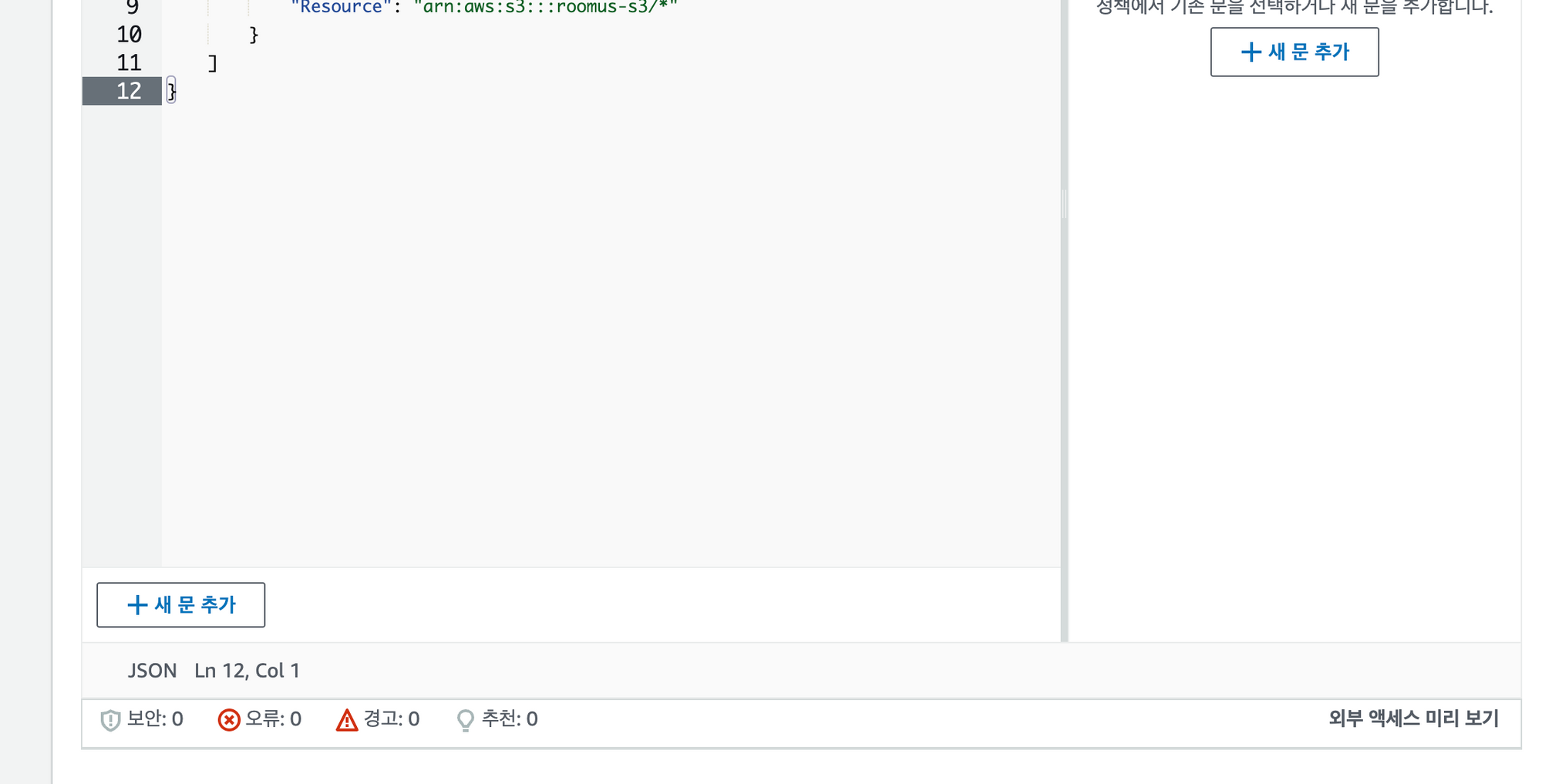 아래쪽에 보면 + 새문 추가 버튼을 눌러서 위와 같이 정책을 추가해 주면 됩니다.