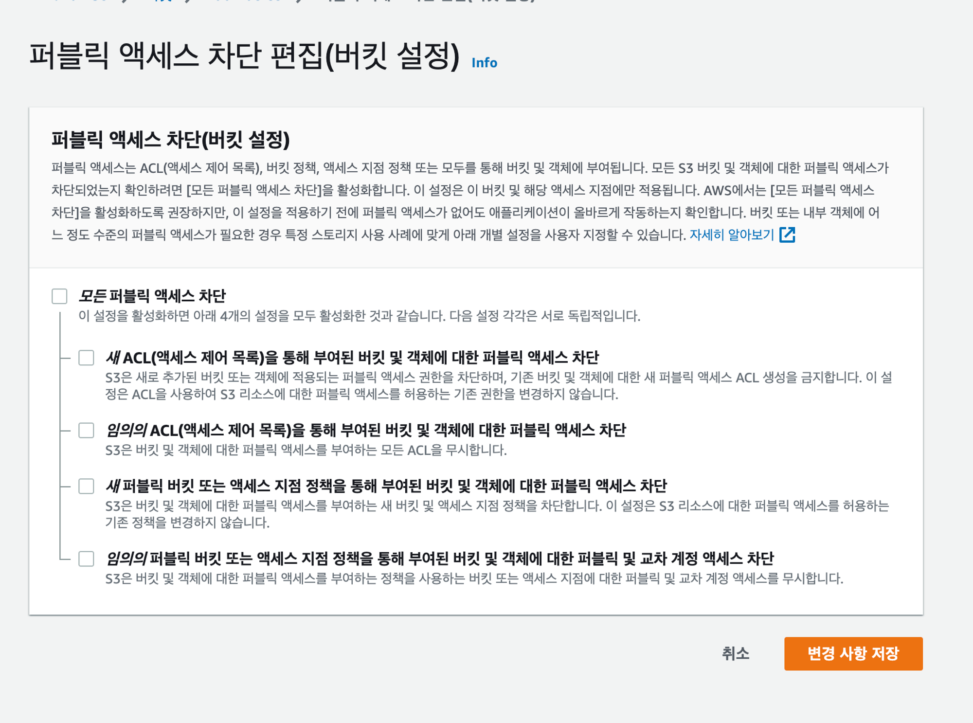 ‘모든 퍼블릭 액세스 차단’ 해제 - 변경 사항 저장