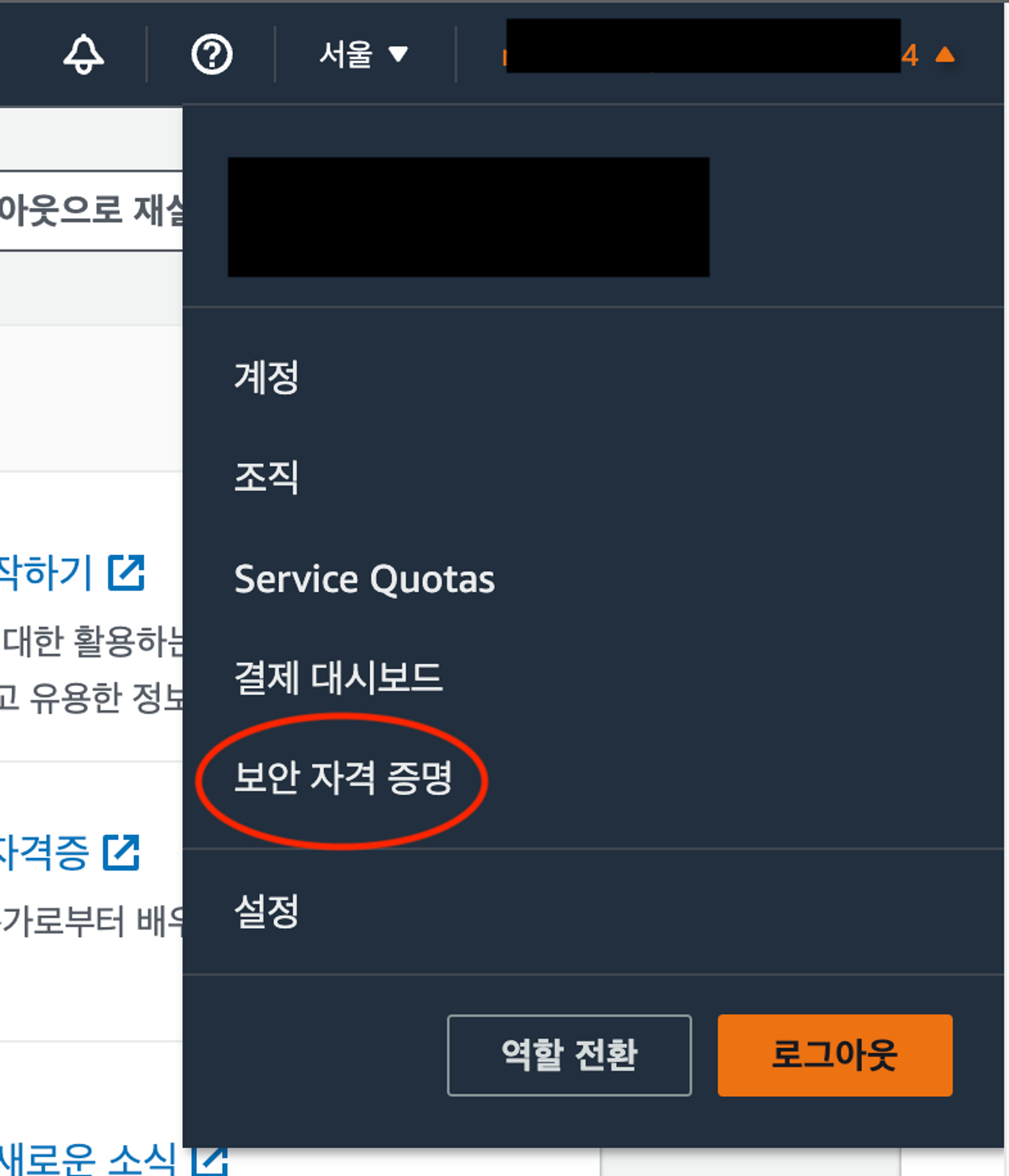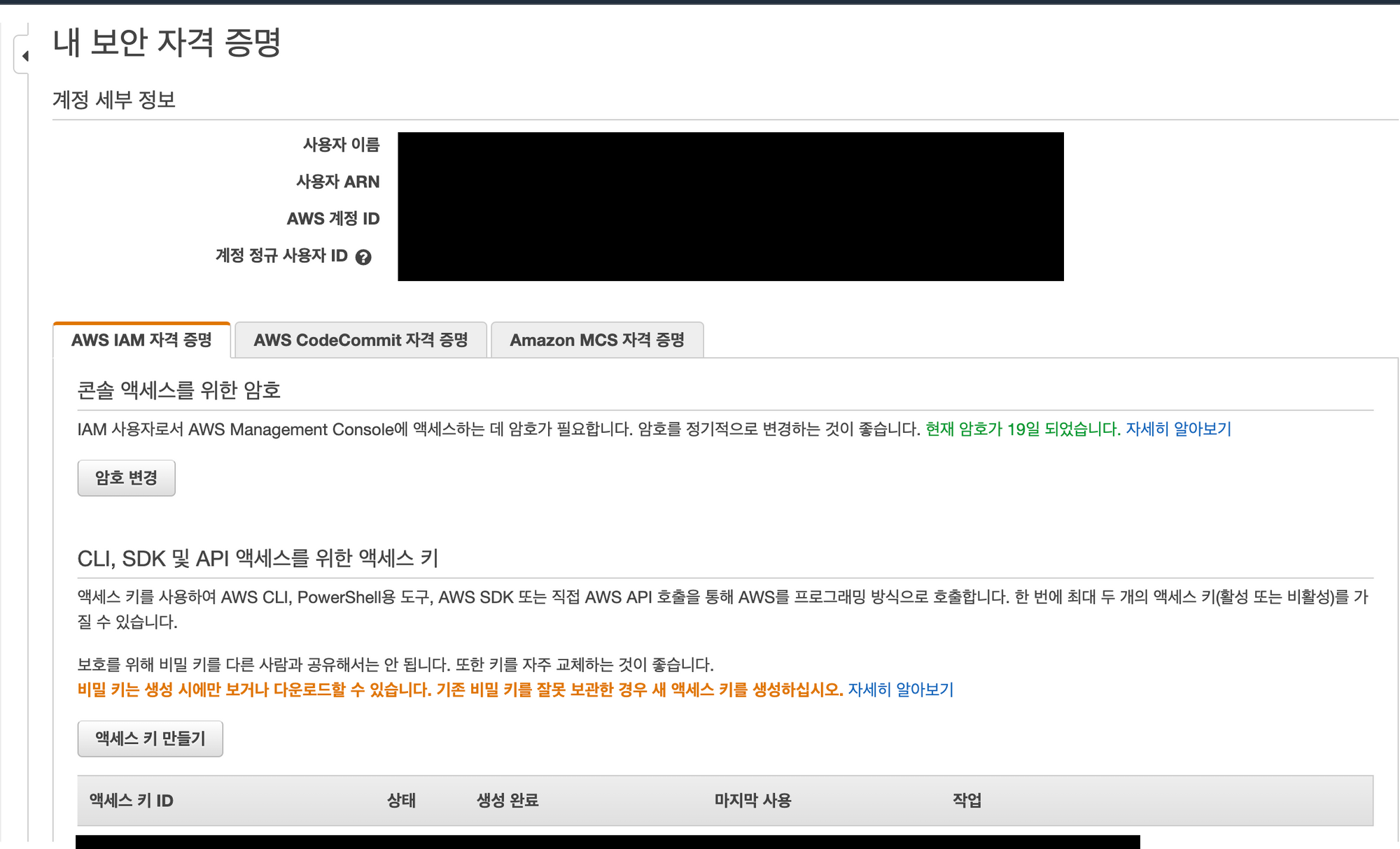 2. 보안 자격증명에 들어가면 아래 액세스 키 만들기 를 통해서 액세스 키를 만들어 주면 됩니다.