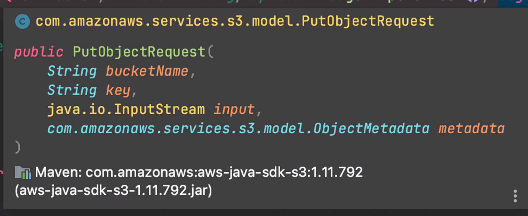 - putObjectRequest: putObject를 요청하기 위한 객체로 bucket, key(파일 이름), input(업로드할 파일), metadata (파일 정보)를 삽입해야 합니다.