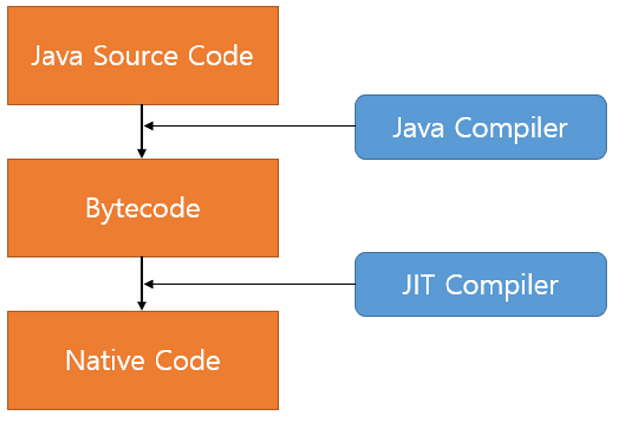 JIT는 인터프리터의 단점을 보안하기 위해서 추가되었다. 인터프리터 방식으로 동작하다가 적절한 시점에 바이트 코드 전체를 네이티브 코드로 바꾸는 작업을 한다. 그다음부터는 네티이브 코드로 컴파일된 코드를 바로 사용한다.