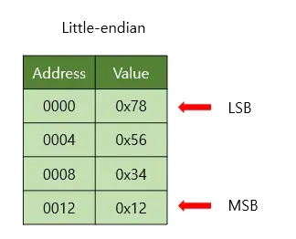 리틀 엔디안: 낮은 주소에 데이터의 낮은 바이트(LSB, Least Significant Byte)를 저장하는 방식. 반대로 읽어어 한다.