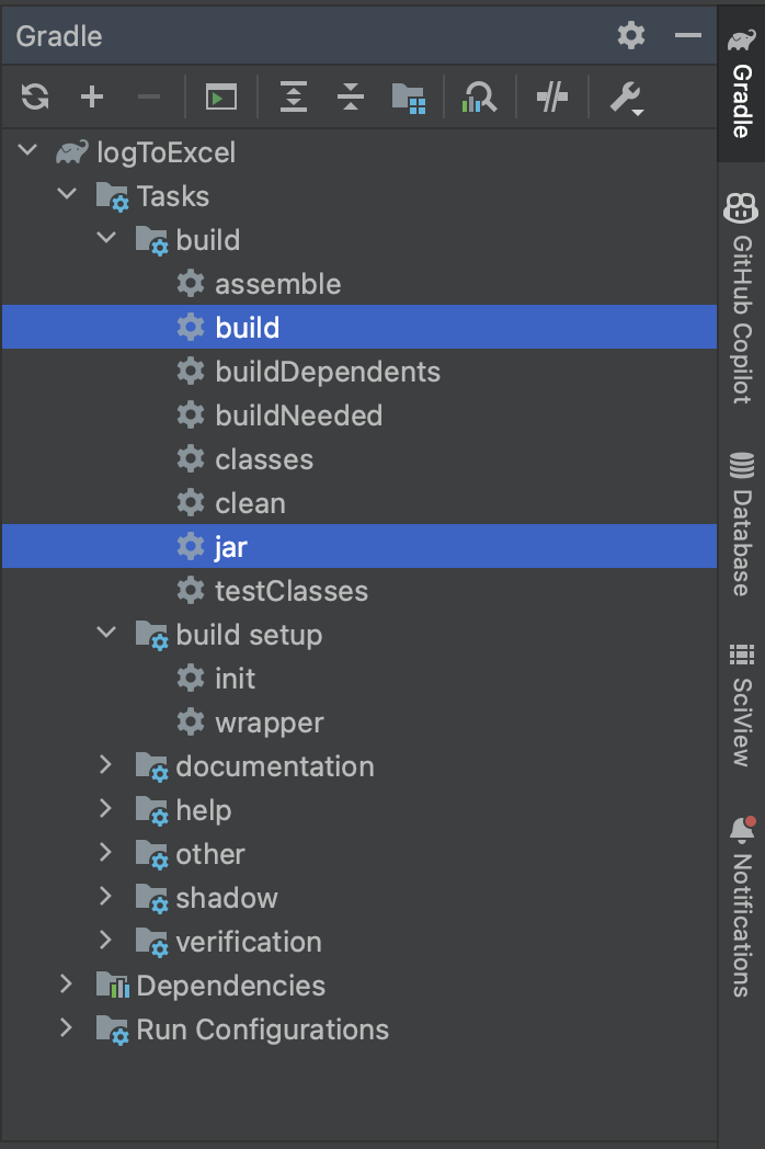 명령어를 실행해 주거나 인텔리제이에서 가장 우측에 보면 Gradle 탭이 있는데 거기에서 Tasks - build에 들어가서 build와 jar를 순서대로 작동시켜 주면 된다.