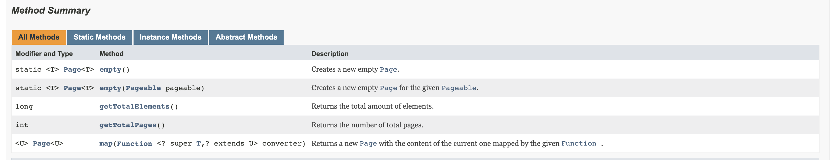 - Page<T> : 콘텐츠 + 페이징 정보 (+ 전체 요소 개수, 전체 페이지 개수)