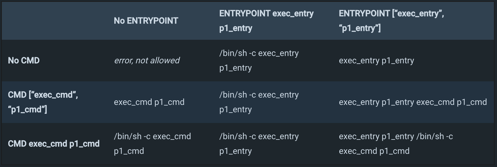 아래 테이블은 CMD + ENTRYPOINT 조합했을 때 동작하는 방식입니다.