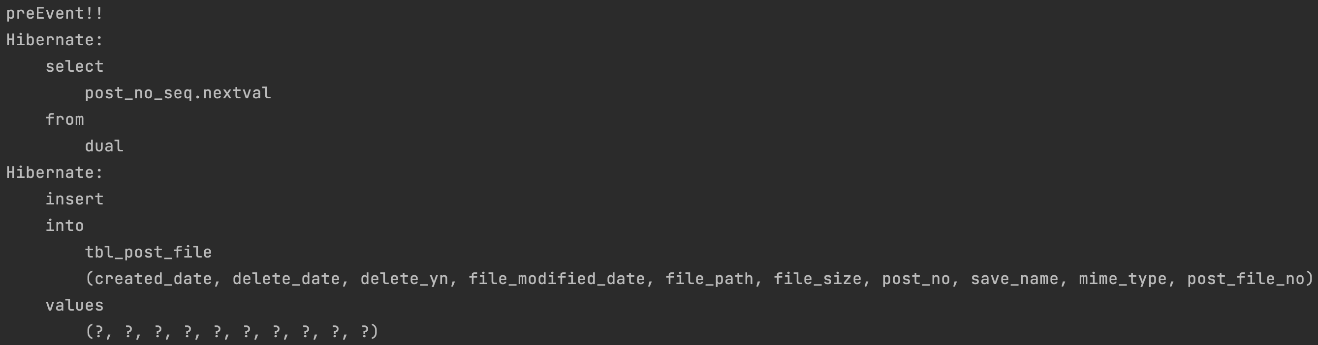 해당 이벤트는 Persist가 발생하기 전에 동작하게 된다. 실행 예시를 보면 preEvent!! 가 insert 되기 전에 동작한 것을 확인할 수 있다.