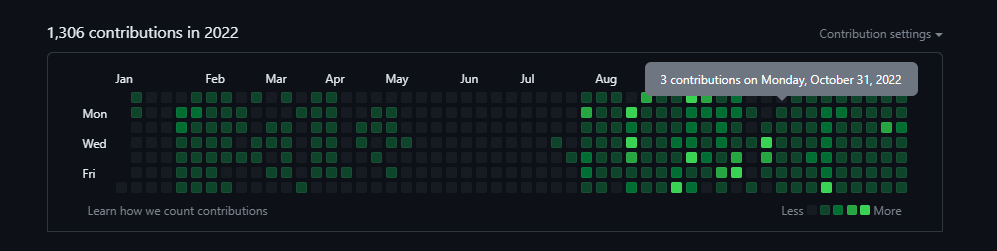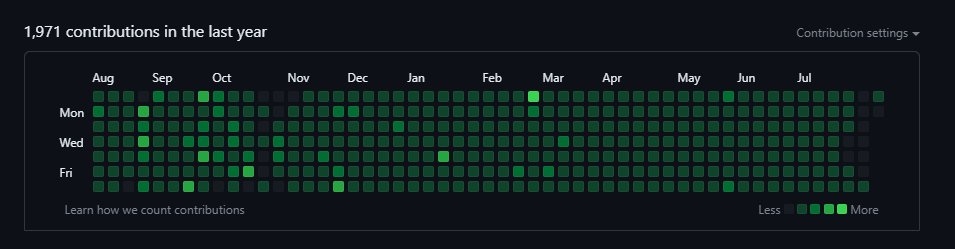 처음에는 익숙하지 않았지만 매일매일 쌓여가는 잔디를 보며 내가 성장하고 있다는 느낌에 뿌듯함을 느꼈다. 점점 일일커밋이 습관이 되고 어느 순간부터는 하루라도 빼먹으면 불안감에 휩싸이는 집착이 되었다...