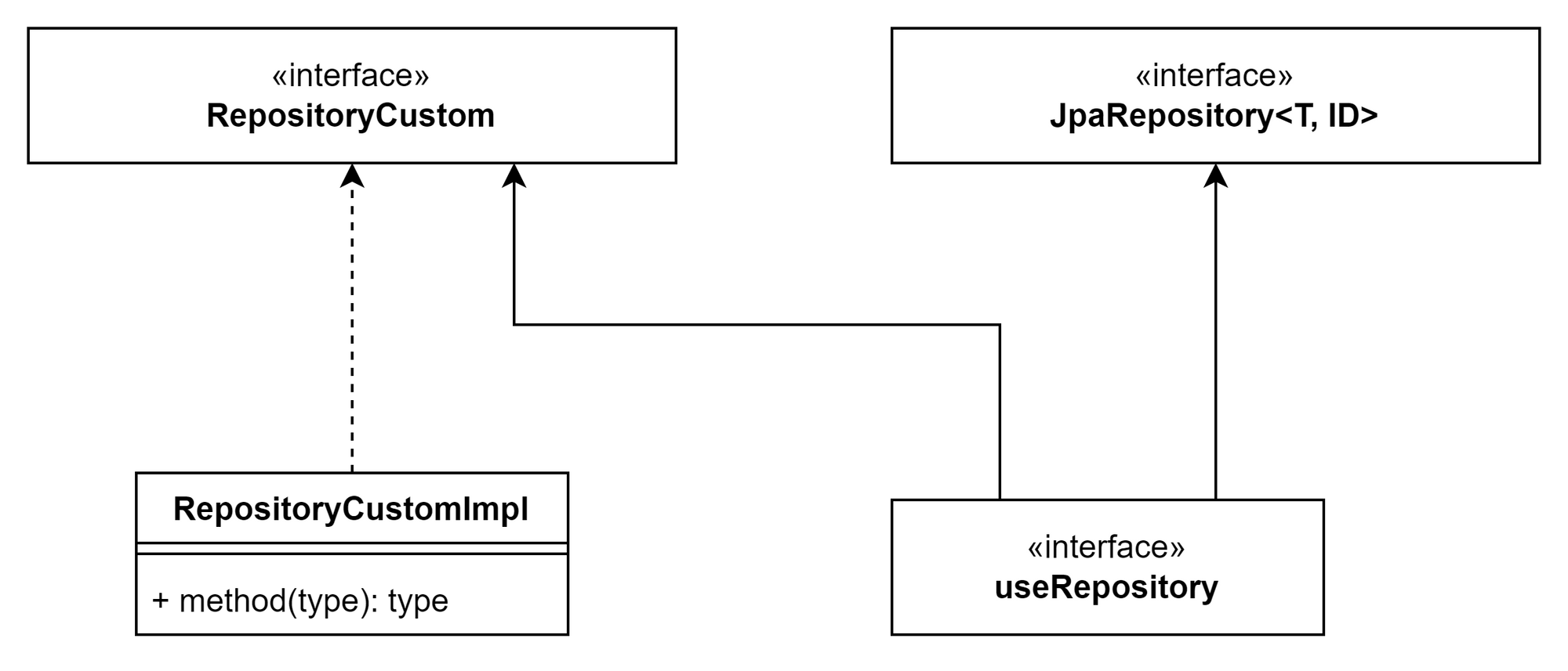 기존에 사용하던 JpaRepository의 기능들 또한 모두 사용해야 하기에 Spring data의 커스텀 레파지토리 만들기를 사용하여 custom Repository를 추가하여 준다. (https://docs.spring.io/spring-data/jpa/docs/2.1.3.RELEASE/reference/html/#repositories.custom-implementations)