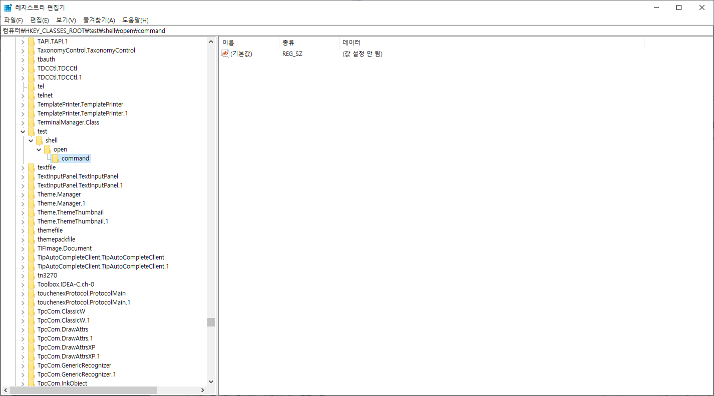 4. 만들어준 key의 하위 키를 만들어 준다. shell - open - command 순으로 만들어 주면 된다.