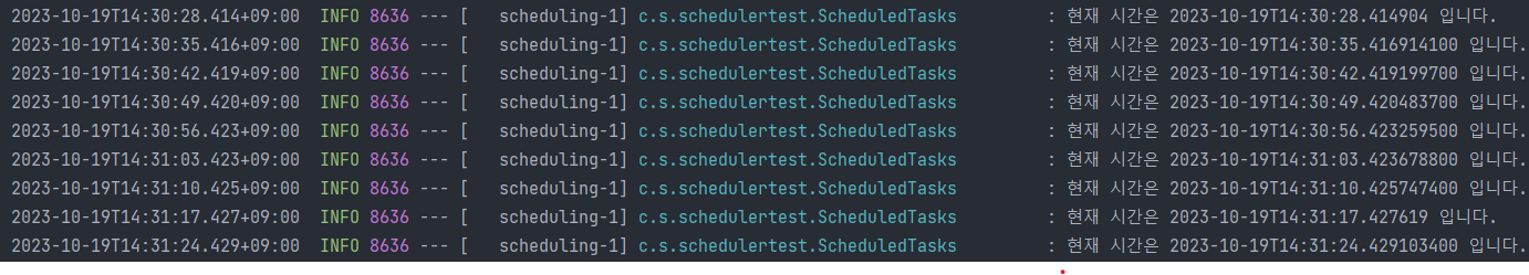 또한 만약 고정된 속도로 실행하고 싶다면 fixedDelay속성이 아닌 fixedRate로 변경해 주면 된다. 그러면 아래와 같이 실행한다.