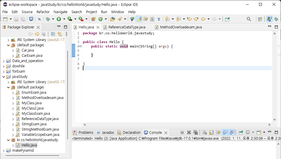 public class PacageExam { public static void main(String[] args) { kr.co.helloWorld.javastudy.Hello exam = new kr.co.helloWorld.javastudy.Hello(); } }