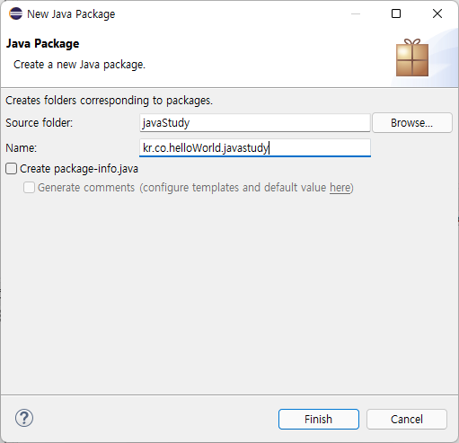 - 패키지 이름에 kr.co.helloWorld.javastudy 입력