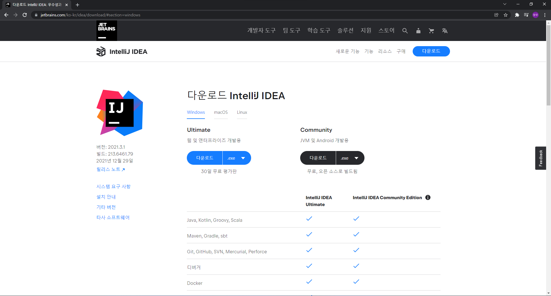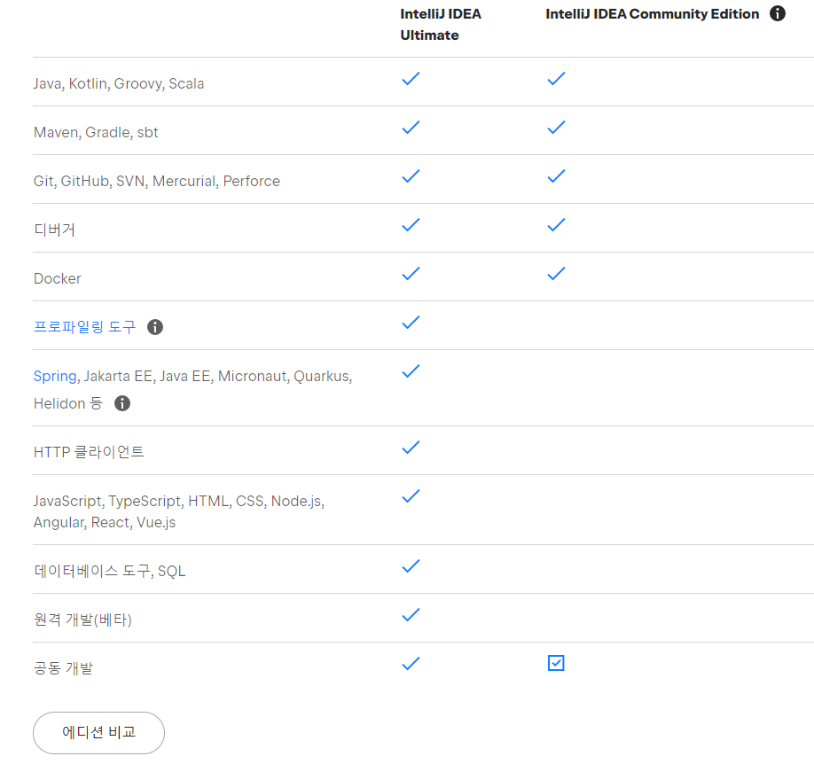 https://www.jetbrains.com/ko-kr/products/compare/?product=idea&product=idea-ce