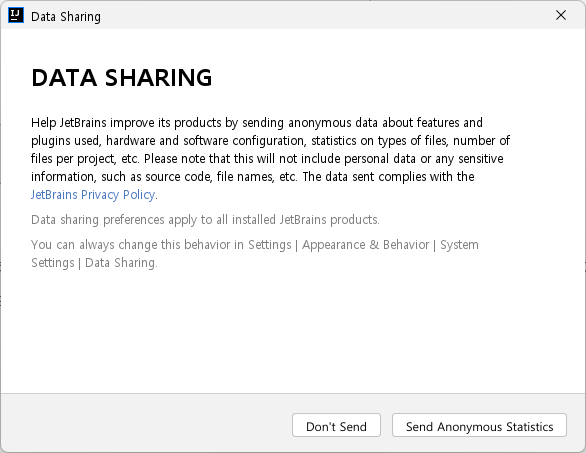 저는 인텔리제이의 발전에 조금이나마 도움이 되라고 Send Anonymous Statistics를 택했습니다.