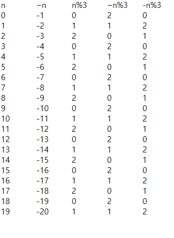 이 알고리즘의 핵심은 이 부분이다. 내가 본 사람은 ~(n)% i로 썼는데 이를 보고 처음에는 이해하기가 어려웠다. 그래서 한번 예로 n=0~19 , i=3으로 잡고 쭉 나열을 해봤다.