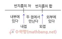 3.2) 내접하는 경우 : |r1-r2|가 d와 같을 때 발생 - 교점이 2개인 경우