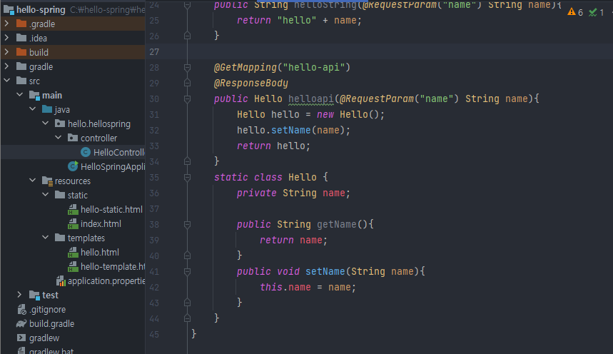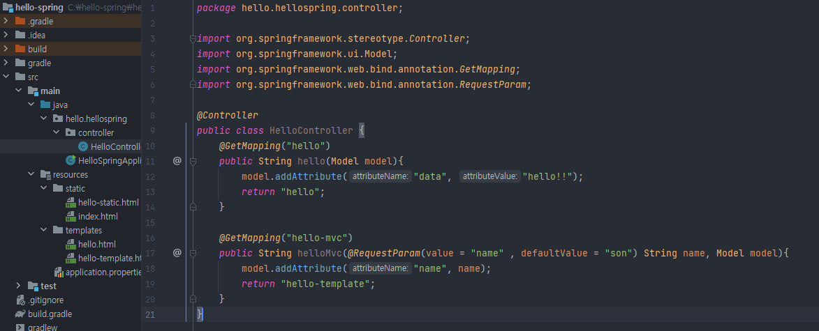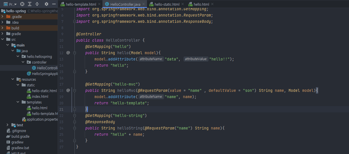 이전에 만들었던 src/main/hello.hellospring/controller/HelloController.java 에 새로운 동작을 추가해보자.