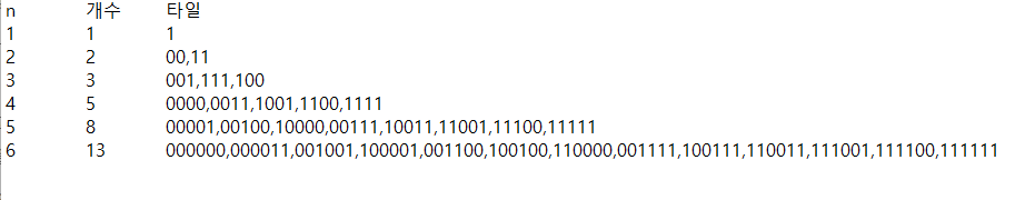 그러므로 지원이는 타일로 더 이상 크기가 N인 모든 2진 수열을 만들 수 없게 되었다. 예를 들어, N=1일 때 1만 만들 수 있고, N=2일 때는 00, 11을 만들 수 있다. (01, 10은 만들 수 없게 되었다.) 또한 N=4일 때는 0011, 0000, 1001, 1100, 1111 등 총 5개의 2진 수열을 만들 수 있다.